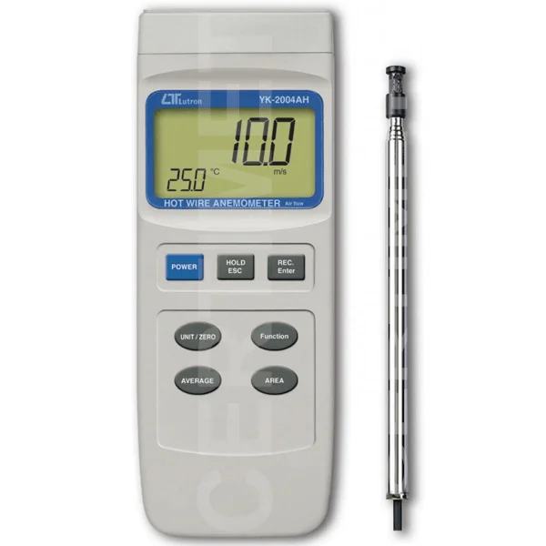 El Anemómetro de hilo caliente YK-2004AH de LUTRON  es un instrumento portátil diseñado para la medición precisa de velocidad del aire, flujo volumétrico y temperatura en aplicaciones industriales, ambientales y HVAC. Su sensor de hilo caliente de alta sensibilidad permite detectar variaciones mínimas del caudal, ofreciendo resultados confiables incluso en bajas velocidades de aire.