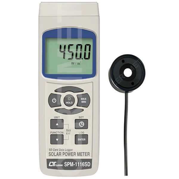 El Medidor de Energía Solar LUTRON SP-1116SD es un instrumento especializado para la medición de radiación solar (irradiancia) con capacidad de registro de datos en tiempo real.